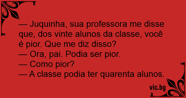 — Juquinha, sua professora me disse que, dos vinte alunos da classe, você é pior. Que me diz disso?