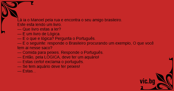 O português Manoel vai passando em frente a uma livraria e vê um amigo saindo com um livro debaixo do braço. — Que livro é esse? — ele pergunta, curioso. — Um livro sobre lógica. — Lógica?! O que é...