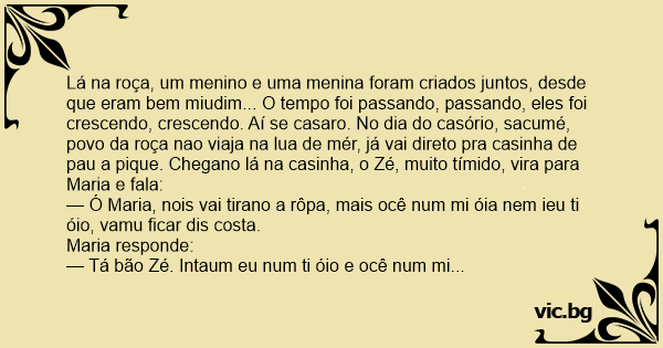 Lá na roça, um menino e uma menina foram criados juntos, desde que eram bem miudim... O tempo foi passando, passando, eles foi crescendo, crescendo. Aí se casaro. No dia do casório, sacumé, povo da roça nao viaja na lua de mér, já vai direto pra casinha de раu a pique. Chegano lá na casinha, o Zé, muito tímido, vira para Maria e fala: