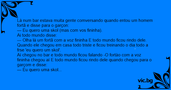 Aí chegou no bar e todo mundo ficou falando -O fortào com a voz fininha chegou aí E todo mundo ficou rindo dele quando chegou para o garçom e disse: