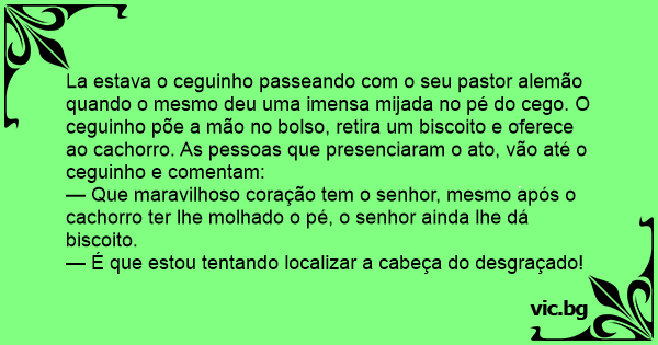 La estava o ceguinho passeando com o seu pastor alemão quando o mesmo deu uma imensa mijada no pé do cego. O ceguinho põe a mão no bolso, retira um biscoito e oferece ao сасhоrrо. As pessoas que presenciaram o ato, vão até o ceguinho e comentam: