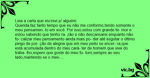Querida,faz tanto tempo que eu não me conformo,tendo somente o meu pensamen- to em você. Por isso,estou com grande te- mor e estou sabendo que tenho ra- zão e não descansarei enquanto não fo- calizar meu pensamento ainda mais po- der até esgotar o último pingo de por- ção de alegria que em meu peito se encer- ra,que está acumulada dentro do meu cará- ter de homem que vive do traba- lho,espero que goste do meu fu- turo,sempre ao seu lado,mantendo-se o mes- mo que sempre esperou por você.