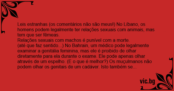 Leis estranhas (os comentários não são meus!) No Líbano, os homens podem legalmente ter relações sexuais com animais, mas tem que ser fêmeas.