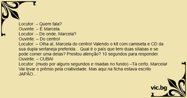 Locutor: – Olha aí, Marcela do centro! Valendo o kit com camiseta e CD da sua dupla sertaneja preferida... Qual é o país que tem duas sílabas e se pode comer uma delas? Prestou atenção? 10 segundos para responder.