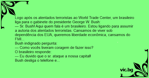 — Sr. Bush! Aqui quem fala é um brasileiro. Estou ligando para assumir a autoria dos atentados terroristas. Cansamos de viver sob dependência dos EUA, queremos liberdade econômica, cansamos do FMI...