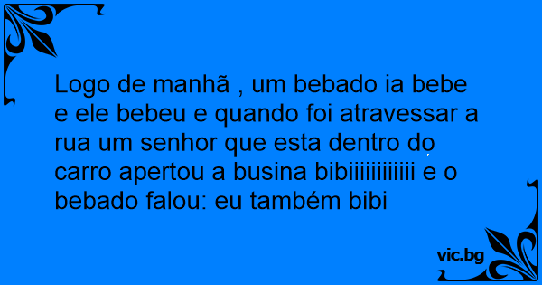 Logo de manhã , um bebado ia bebe e ele bebeu e quando foi atravessar a rua um senhor que esta dentro do carro apertou a busina bibiiiiiiiiiiii e o bebado falou: eu também bibi