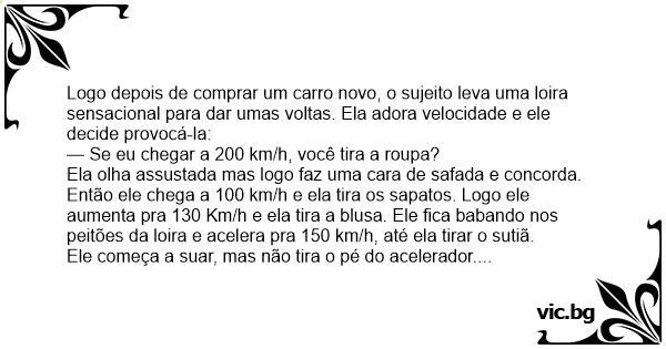 Então ele chega a 100 km/h e ela tira os sapatos. Logo ele aumenta pra 130 Km/h e ela tira a blusa. Ele fiса babando nos peitões da loira e acelera pra 150 km/h, até ela tirar o sutiã.