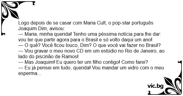 — Eu já pensei em tudo, querida! Vou mandar um vidro com o meu esperma e você faz o trabalho por mim! Aí quando eu voltar para Lisboa, o Quinzinho já vai ter nascido!