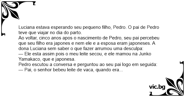 Ao voltar, cinco anos apos o nascimento de Pedro, seu pai percebeu que seu filho era japones e nem ele e a esposa eram japoneses. A dona Luciana sem saber o que fazer arrumou uma desculpa: