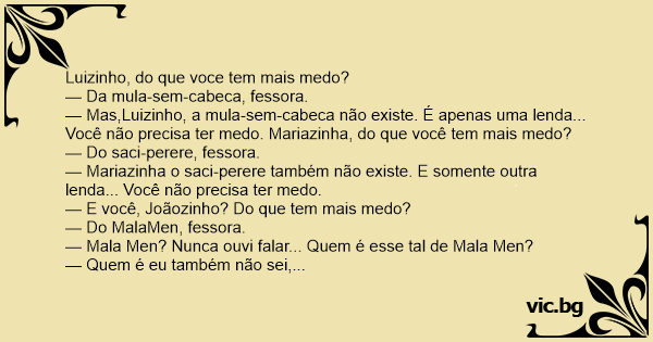— Quem é eu também não sei, fessora. Mas toda noite minha mãe diz na oração: Não nos deixes cair em tentação mas livrai-nos do Mala-Men.