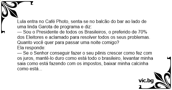 Lula entra no Café Photo, senta-se no balcão do bar ao lado de uma linda Garota de programa e diz: