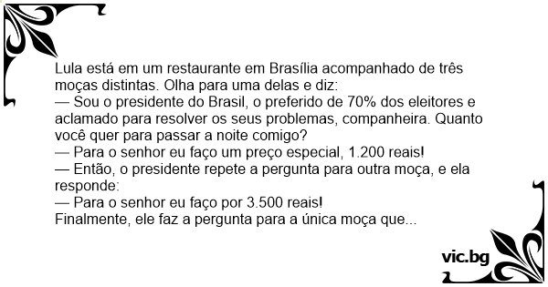 — Sou o presidente do Brasil, o preferido de 70% dos eleitores e aclamado para resolver os seus problemas, companheira. Quanto você quer para passar a noite comigo?