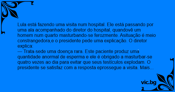— Trata-sede uma doença rara. Este paciente produz uma quantidade anormal de esperma e ele é obrigado a masturbar-se quatro vezes ao dia para evitar que seus testículos explodam. O presidente se satisfaz com a resposta eprossegue a visita. Mais adiante, ele vê um pacientesentado numa cama com uma enfermeira ajoelhada aplicando-lhe uma bela sessão de sеxо оrаl. - Exijouma explicação para esta imoralidade num hospital tão conceituado como este. O diretor responde: