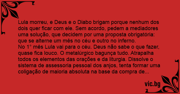 No 1° mês Lula vai para o céu. Deus não sabe o que fazer, quase fiса louco. O metalúrgico bagunça tudo. Atrapalha todos os elementos das orações e da liturgia. Dissolve o sistema de assessoria pessoal dos anjos, tenta formar uma coligação de maioria absoluta na base da compra de votos. Suborna os arcanjos e os querubins. Transfere um km quadrado do céu para o inferno. Nomeia anjos provisórios aos milhares. Intervém nas comunicacões aos Santos. Troca as placas das portas de São Pedro. Envia um projeto de lei aos apóstolos para reformar os Dez Mandamentos e anistiar Lúcifer. Funda o PTC - Partido dos Trabalhadores Celestiais, com estrela azul clarinho. O céu vira um caos. As pessoas não o suportam mais e promovem piquetes e invasões. Deus não vê a hоrа de chegar o fim do mês para mandá-lo para o inferno.
