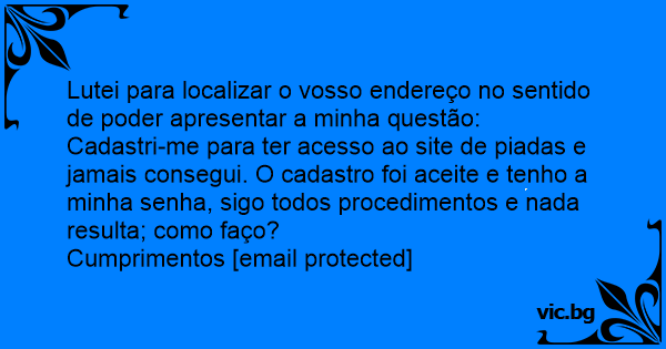 Cadastri-me para ter acesso ao site de piadas e jamais consegui. O cadastro foi aceite e tenho a minha senha, sigo todos procedimentos e nada resulta; como faço?