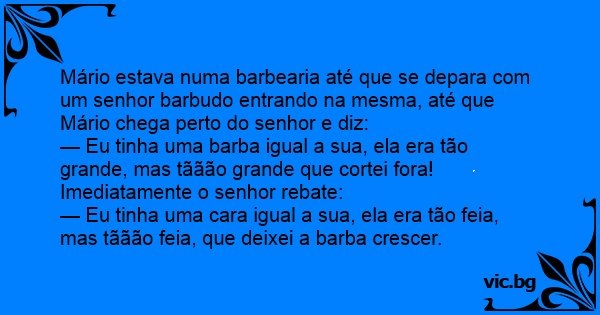 Mário estava numa barbearia até que se depara com um senhor barbudo entrando na mesma, até que Mário chega perto do senhor e diz: