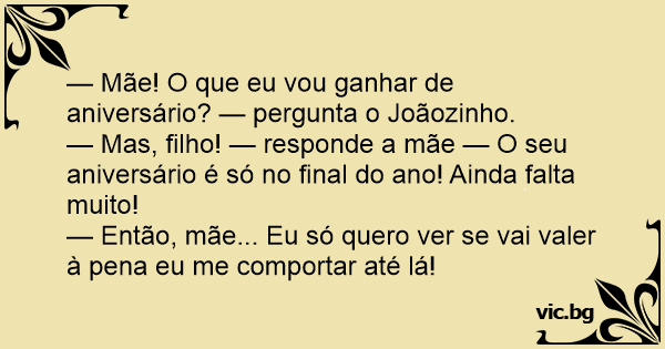 — Mãe! O que eu vou ganhar de aniversário? — pergunta o Joãozinho.
