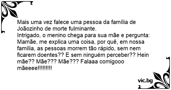 Intrigado, o menino chega para sua mãe e pergunta: Mamãe, me explica uma coisa, por quê, em nossa família, as pessoas morrem tão rápido, sem nem ficarem doentes?? E sem ninguém perceber?? Hein mãe?? Mãe??? Mãe??? Falaaa comigooo mãeeee!!!!!!!!!