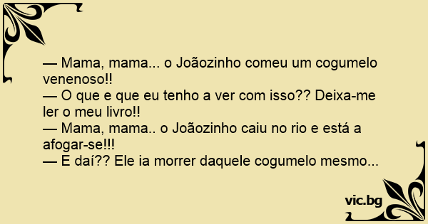 — Mama, mama... o Joãozinho comeu um cogumelo venenoso!!