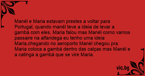 Manél e Maria estavam prestes a voltar para Portugal, quando manél teve a ideia de levar a gambá com eles, Maria falou mas Manél como vamos passaire na alfandega eu tenho uma ideia Maria,chegando no aeroporto Manél chegou pra Maria coloca a gambá dentro das calças mas Manél e a catinga a gambá que se vire Maria.
