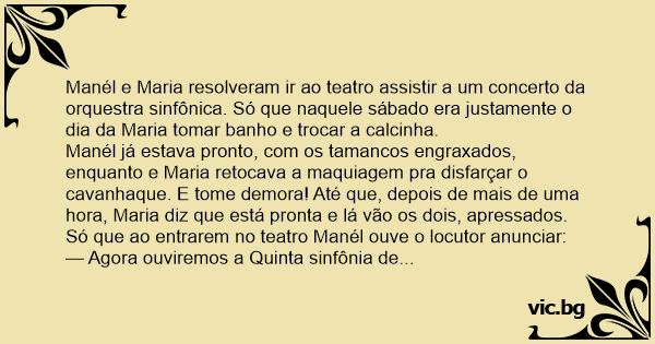 Manél e Maria resolveram ir ao teatro assistir a um concerto da orquestra sinfônica. Só que naquele sábado era justamente o dia da Maria tomar banho e trocar a calcinha.