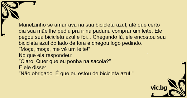 Manelzinho se amarrava na sua bicicleta azul, até que certo dia sua mãe lhe pediu pra ir na padaria comprar um leite. Ele pegou sua bicicleta azul e foi... Chegando lá, ele encostou sua bicicleta azul do lado de fora e chegou logo pedindo: