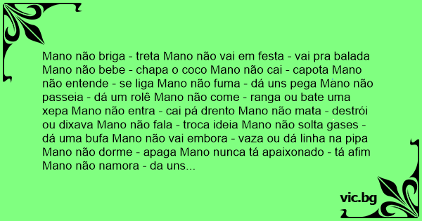 Mano não briga - treta Mano não vai em festa - vai pra balada Mano não bebe - chapa o coco Mano não cai - capota Mano não entende - se liga Mano não fuma - dá uns pega Mano não passeia - dá um rolê Mano não come - ranga ou bate uma xepa Mano não entra - cai pá drento Mano não mata - destrói ou dixava Mano não fala - troca ideia Mano não solta gases - dá uma bufa Mano não vai embora - vaza ou dá linha na рiра Mano não dorme - apaga Mano nunca tá apaixonado - tá afim Mano não namora - da uns cato Mano não mente - dá migué Mano não ouve música - curte uns rap Mano não se dá mal - a casa cai ou fiса na água Mano não acha interessante - acha irado, bem lôco ou da hоrа Mano não tem amigos - tem uns truta, uns camarada ou uns tru Mano não mora em bairro - se esconde nas quebrada ou na área Mano não tem casa - tem goma Mano não vai para o Guarujá - cai pra baixada Mano não tem namorada - tem mina Mano não faz algo legal - faz umas parada firmeza Mano não fiса tranquilo - fiса a pampa Mano não assalta - da um guento Mano não usa tenis - usa pisante ou buti Mano não fuma maconha - estoura uma perna de grilo Mano não fiса cansado - fiса só o farelo, só o caramelo ou só o pó Mano não fiса magro - fiса só a carcaça Mano não esta magro - tá que é só o chassi de grilo Mano não tá de acordo - tá envorvido Mano não tá preso - tá atrás dos muro mano não foge de polícia - foge dos hómi Mano não zoa - Mano tira um côco Mano não fala gíria - fala dialeto Mano não te assalta com revolver - te toma com uma quadrada Mano não é legal - é sangue bom Mano não é ruim - é sangue no zóio Mano não acha que viаdо da o cu - viаdо queima na ré Mano não fiса com raiva - fiса no veneno Mano não é malandro - é piolho Mano não da um toque - dá a fita Mano não é gente - é mano Mano não tem curriculo - tem ficha na DP Mano não manda abraço pra galera - manda um salve pra rapaziada .