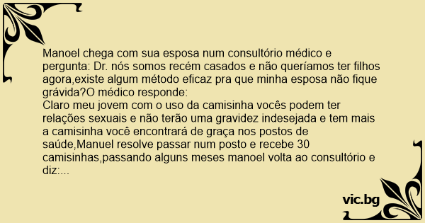 Como vc usou a camisinha?Manuel responde: eu tomei 3 vezes ao dia,o médico novamente pergunta: