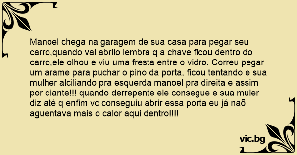 Manoel chega na garagem de sua casa para pegar seu carro,quando vai abrilo lembra q a chave ficou dentro do carro,ele olhou e viu uma fresta entre o vidro. Correu pegar um arame para puchar o pino da porta, ficou tentando e sua mulher alciliando pra esquerda manoel pra direita e assim por diante!!! quando derrepente ele consegue e sua muler diz até q enfim vc conseguiu abrir essa porta eu já naõ aguentava mais o calor aqui dentro!!!!