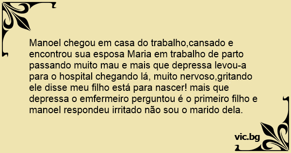 Manoel chegou em casa do trabalho,cansado e encontrou sua esposa Maria em trabalho de parto passando muito mau e mais que depressa levou-a para o hospital chegando lá, muito nervoso,gritando ele disse meu filho está para nascer! mais que depressa o emfermeiro perguntou é o primeiro filho e manoel respondeu irritado não sou o marido dela.