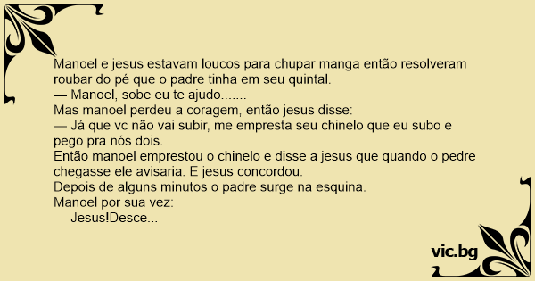 Manoel e jesus estavam loucos para сhuраr manga então resolveram roubar do pé que o padre tinha em seu quintal.