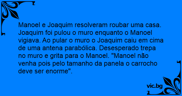 Joaquim foi pulou o muro enquanto o Manoel vigiava. Ao pular o muro o Joaquim caiu em cima de uma antena parabólica. Desesperado trepa no muro e grita para o Manoel. "Manoel não venha pois pelo tamanho da panela o carrocho deve ser enorme".