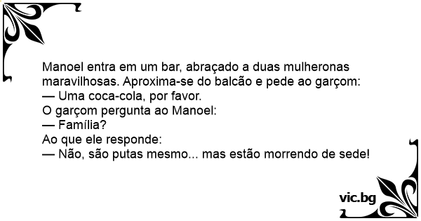 Manoel entra em um bar, abraçado a duas mulheronas maravilhosas. Aproxima-se do balcão e pede ao garçom: