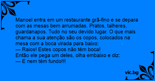 Manoel entra em um restaurante grã-fino e se depara com as mesas bem arrumadas. Pratos, talheres, guardanapos. Tudo no seu devido lugar. O que mais chama a sua atenção são os copos, colocados na mesa com a boca virada para baixo: