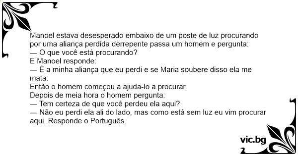 Manoel estava desesperado embaixo de um poste de luz procurando por uma aliança perdida derrepente passa um homem e pergunta: