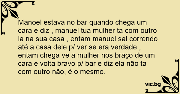 Manoel estava no bar quando chega um cara e diz , manuel tua mulher ta com outro la na sua casa , entam manuel sai correndo até a casa dele p/ ver se era verdade , entam chega ve a mulher nos braço de um cara e volta bravo p/ bar e diz ela não ta com outro não, é o mesmo.