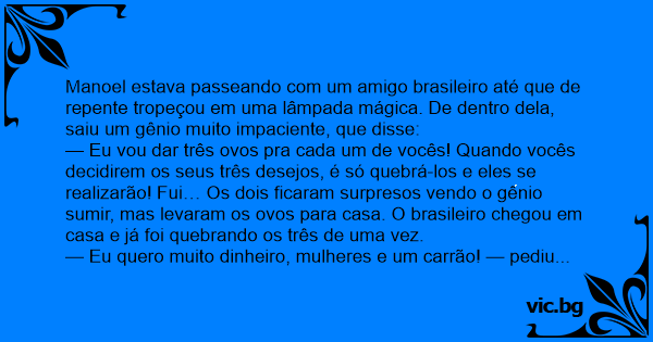 Manoel estava passeando com um amigo brasileiro até que de repente tropeçou em uma lâmpada mágica. De dentro dela, saiu um gênio muito impaciente, que disse: