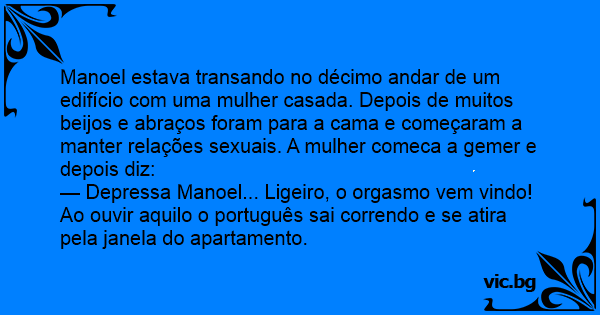 Manoel estava transando no décimo andar de um edifício com uma mulher casada. Depois de muitos beijos e abraços foram para a cama e começaram a manter relações sexuais. A mulher comeca a gemer e depois diz:
