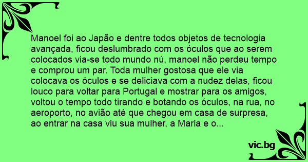 Manoel foi ao Japão e dentre todos objetos de tecnologia avançada, ficou deslumbrado com os óculos que ao serem colocados via-se todo mundo nú, manoel não perdeu tempo e comprou um par. Toda mulher gostosa que ele via colocava os óculos e se deliciava com a nudez delas, ficou louco para voltar para Portugal e mostrar para os amigos, voltou o tempo todo tirando e botando os óculos, na rua, no aeroporto, no avião até que chegou em casa de surpresa, ao entrar na casa viu sua mulher, a Maria e o comprade totalmente pelados no sofá, então tirou os óculos, botou, tirou e continuavam nús. Então exclama: Ora raios não é que esta geringonça já está com defeito.