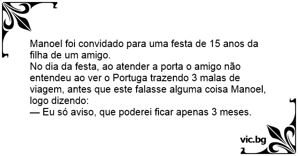 No dia da festa, ao atender a porta o amigo não entendeu ao ver o Portuga trazendo 3 malas de viagem, antes que este falasse alguma coisa Manoel, logo dizendo: