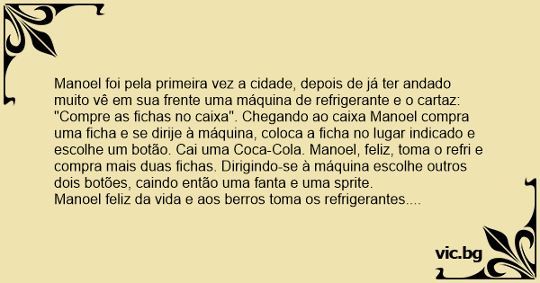 "Compre as fichas no caixa". Chegando ao caixa Manoel compra uma ficha e se dirije à máquina, coloca a ficha no lugar indicado e escolhe um botão. Cai uma Coca-Cola. Manoel, feliz, toma o refri e compra mais duas fichas. Dirigindo-se à máquina escolhe outros dois botões, caindo então uma fanta e uma sprite.
