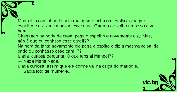 Manoel ia cominhando pela rua, quano acha um esplho, olha pro espelho e diz: eu conhesso esse cara. Guarda o esplho no bolso e vai bora.
