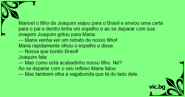 Manoel o filho de Joaquim viajou para o Brasil e enviou uma carta para o pai e dentro tinha um espelho e ao se deparar com sua imagem Joaquim gritou para Maria: