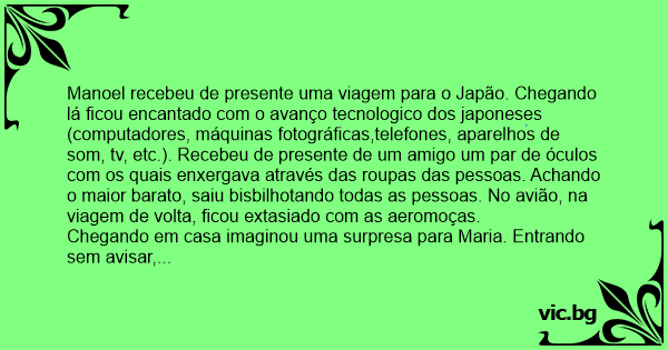 Manoel recebeu de presente uma viagem para o Japão. Chegando lá ficou encantado com o avanço tecnologico dos japoneses (computadores, máquinas fotográficas,telefones, aparelhos de som, tv, etc.). Recebeu de presente de um amigo um par de óculos com os quais enxergava através das roupas das pessoas. Achando o maior barato, saiu bisbilhotando todas as pessoas. No avião, na viagem de volta, ficou extasiado com as aeromoças.