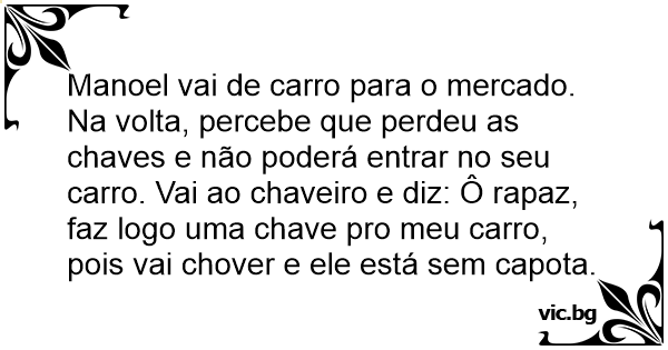 Manoel vai de carro para o mercado. Na volta, percebe que perdeu as chaves e não poderá entrar no seu carro. Vai ao chaveiro e diz: Ô rapaz, faz logo uma chave pro meu carro, pois vai chover e ele está sem capota.