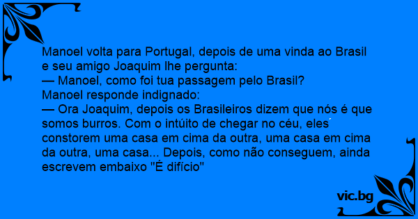 — Ora Joaquim, depois os Brasileiros dizem que nós é que somos burros. Com o intúito de chegar no céu, eles constorem uma casa em cima da outra, uma casa em cima da outra, uma casa... Depois, como não conseguem, ainda escrevem embaixo "É difício"