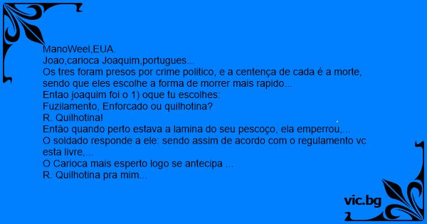 R. Pois pois e voce ta me achando com cara de вurrо? vc nao me perguntou o que eu queria pra morrer rapido, como é que eu posso escolhe a quilhotina se ela esta emperrada,...