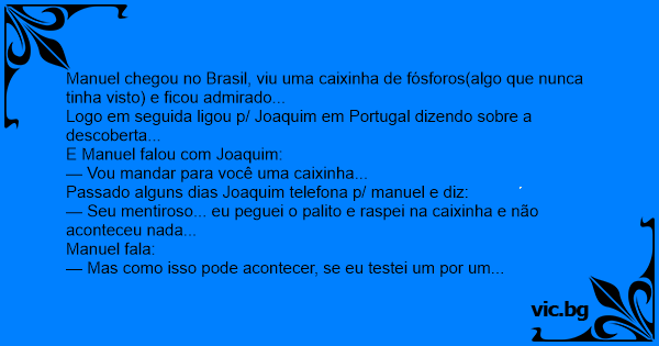 Manuel chegou no Brasil, viu uma caixinha de fósforos(algo que nunca tinha visto) e ficou admirado...