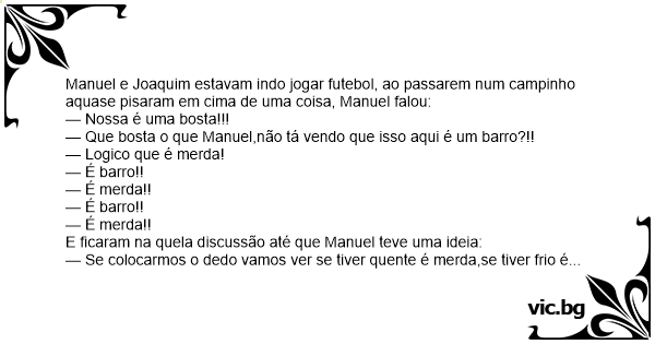 Manuel e Joaquim estavam indo jogar futebol, ao passarem num campinho aquase pisaram em cima de uma coisa, Manuel falou: