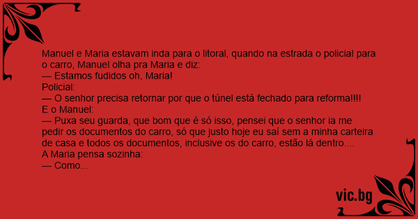 Manuel e Maria estavam inda para o litoral, quando na estrada o policial para o carro, Manuel olha pra Maria e diz: